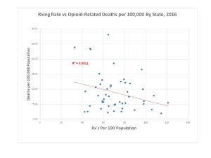 In this real-world data drawn directly from the CDC Wonder database, each point shows the number of overdose-related deaths per hundred thousand population, versus the number of prescriptions written by any doctor, per hundred population. Data are shown for 50 U.S. States plus DC. The data plot looks like a shotgun blast aimed at a barn door. There is no consistent upward trend here. There are instead wide variations from state to state. And there is certainly no correlation or cause-and-effect.